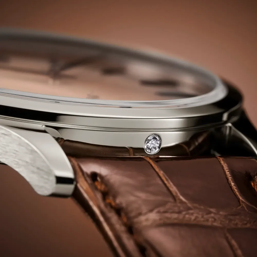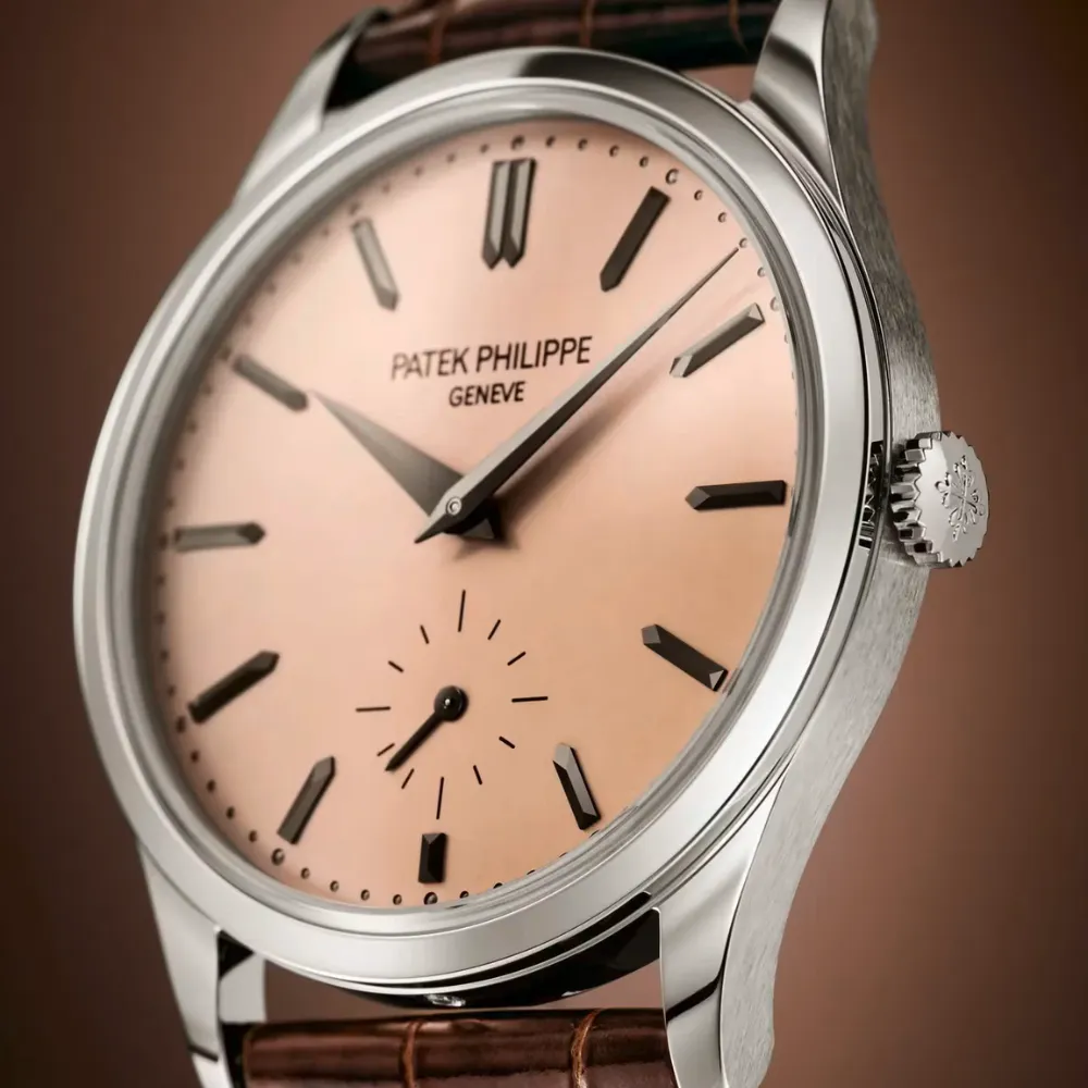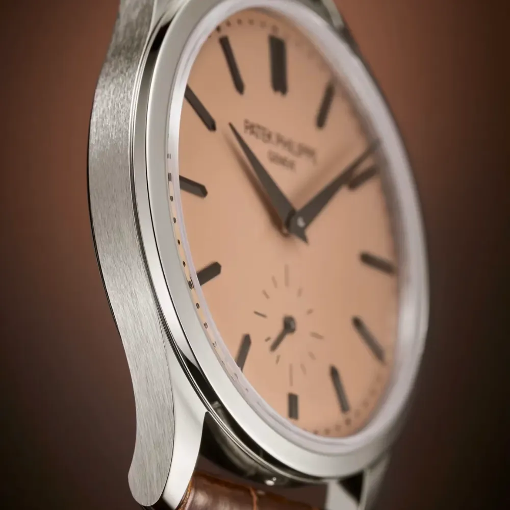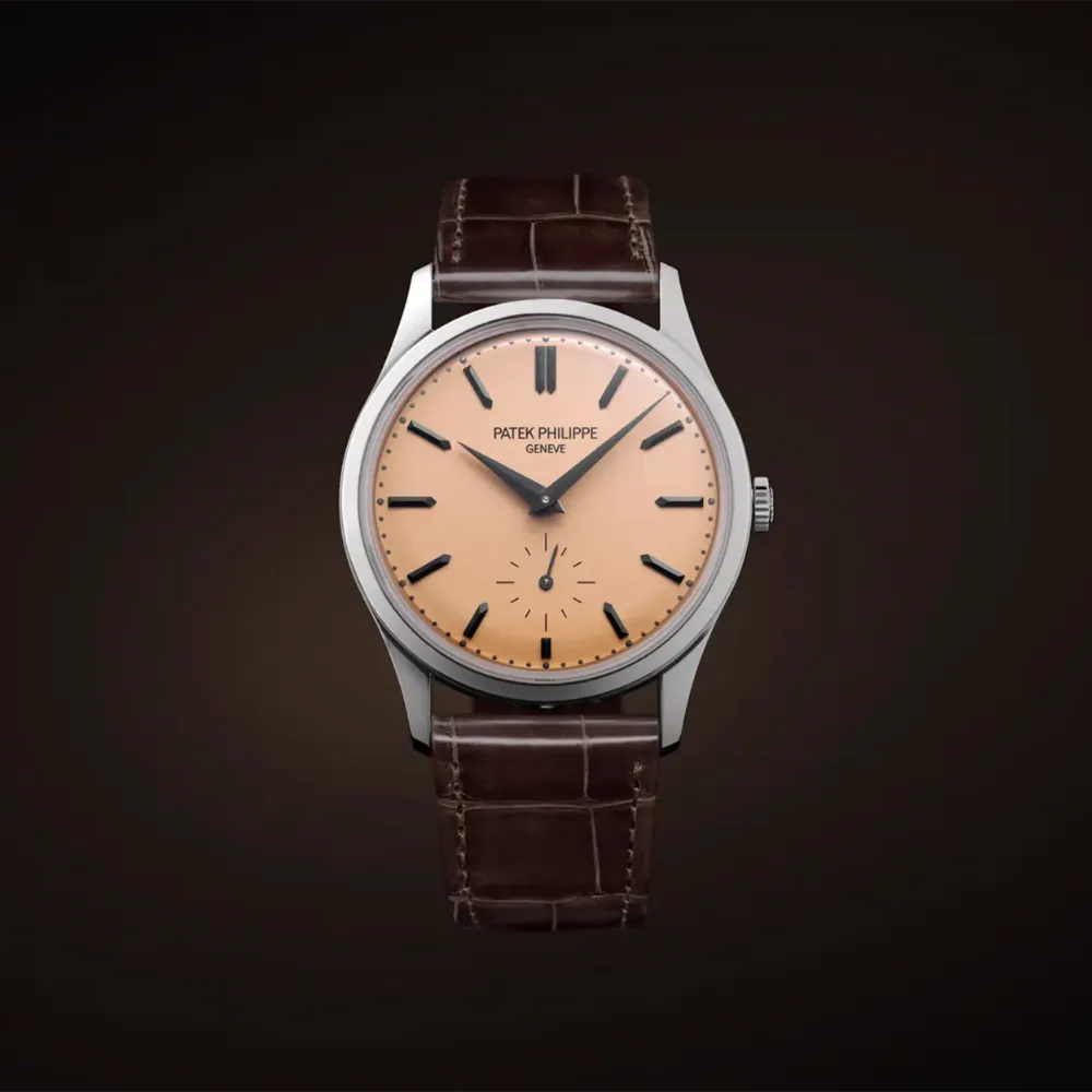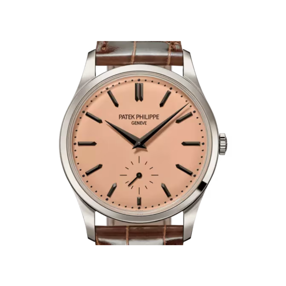 The Patek Philippe Calatrava Ref. 6196P-001 distills the maison’s pure dress-watch aesthetics into a modern platinum execution. With a warm rose-gilt opaline (salmon-toned) dial and a slim hand-wound calibre, it balances timeless elegance with contemporary proportions.