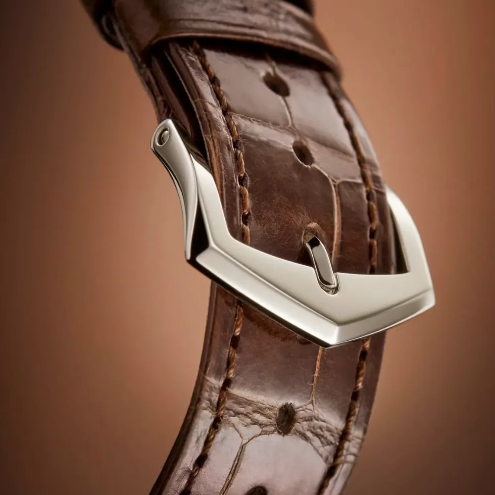 - Strap: Chocolate brown alligator leather, large square scales, hand-stitched.