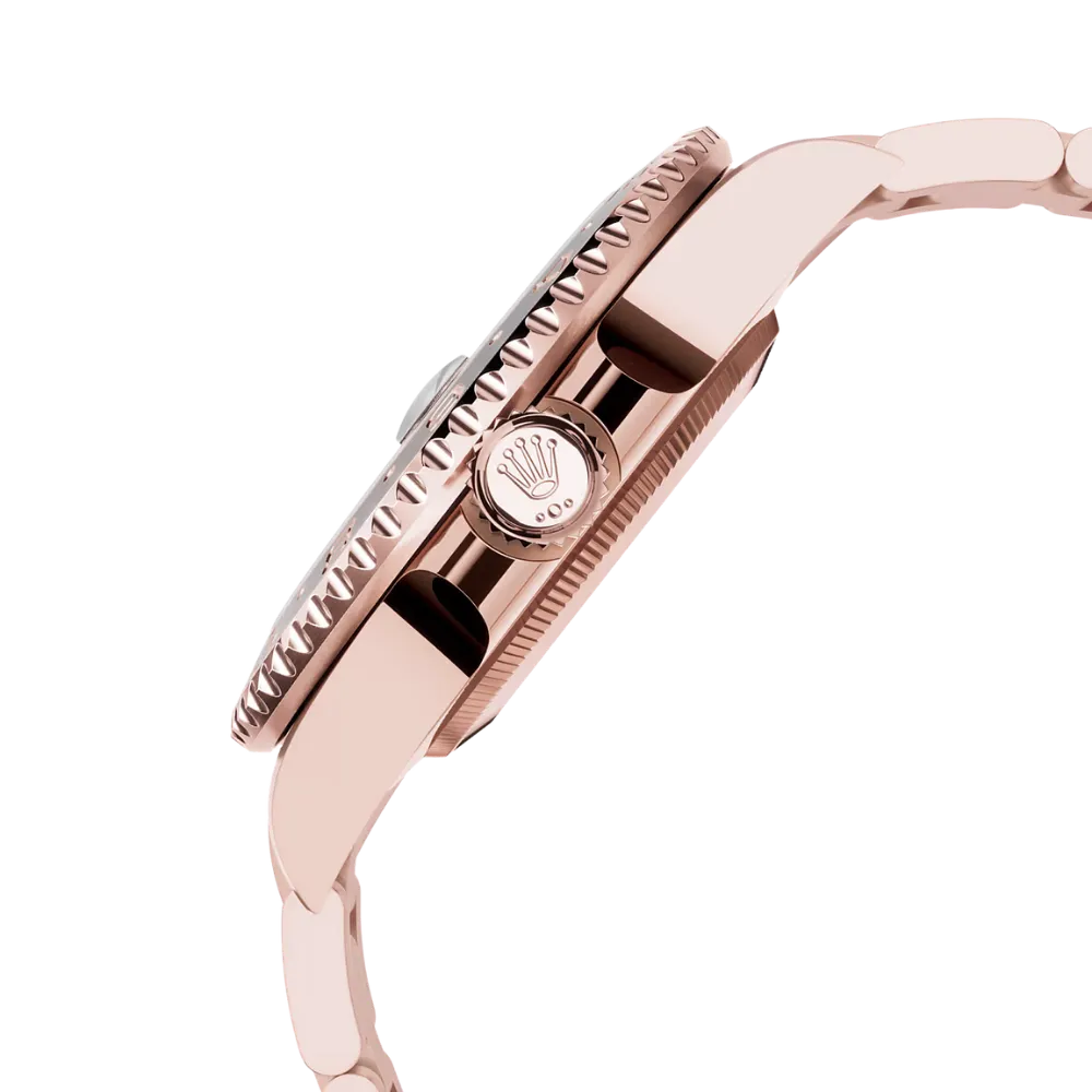 The Rolex GMT-Master II 40 mm Everose Gold Ref. 126715CHNR represents a luxurious interpretation of the iconic travel watch, crafted entirely from 18 kt Everose gold. Its two-tone Cerachrom bezel in black and brown ceramic has earned it the nickname “Root Beer” among enthusiasts, offering a warm and distinguished aesthetic. Designed for world travelers, it combines the practical functionality of a dual time-zone display with the refinement of Everose gold craftsmanship.