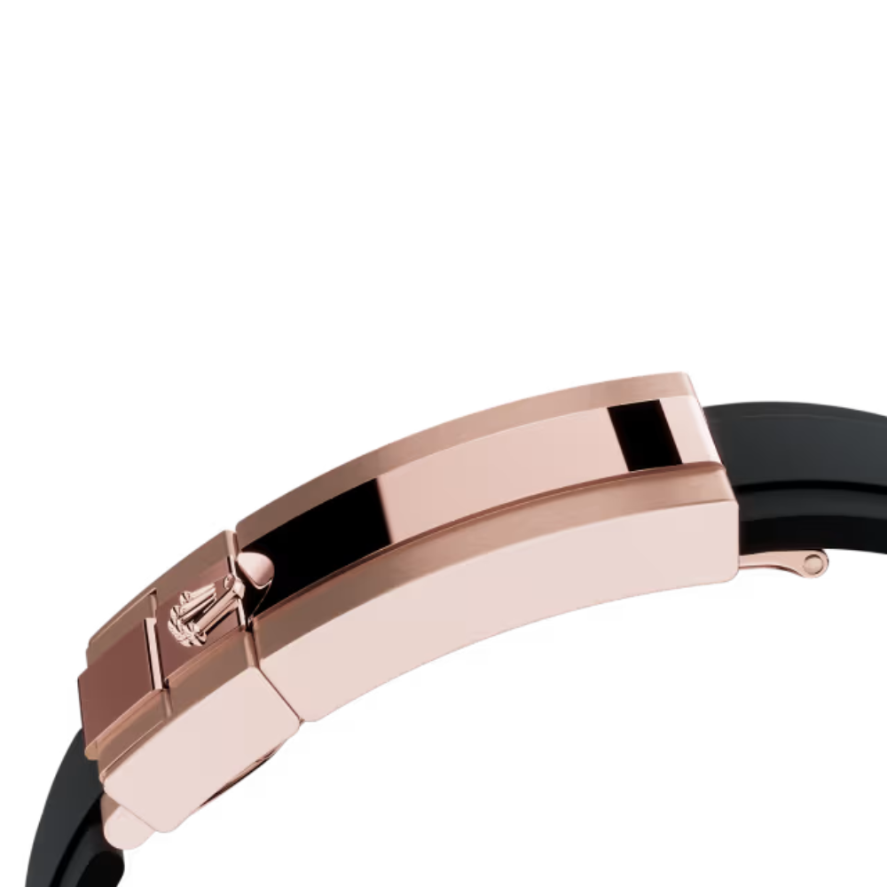 The Rolex Yacht‑Master 40 Ref. 126655‑0002 masterfully balances sporty performance with classic luxury. Crafted entirely from 18 ct Everose gold, this variant reflects Rolex’s commitment to distinctive elegance. It comes on an Oysterflex bracelet (flexible metal blades covered with elastomer) secured by an Oysterlock clasp and equipped with the Glidelock extension system, offering superb comfort and fit adjustment. The bidirectional rotating bezel, featuring a 60-minute graduated scale and a matte-black Cerachrom insert, elegantly combines functionality and visual refinement.